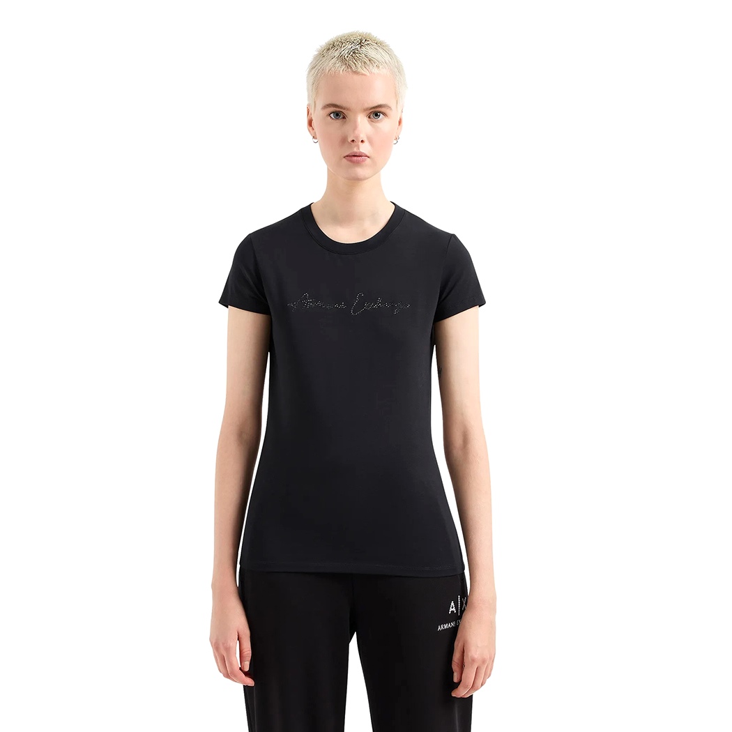 T-shirt slim fit realizzata in jersey di cotone stretch e personalizzata dal logo lettering composto da luminosi glitter. Il modello è completato dallo scollo tondo e dalle maniche corte.