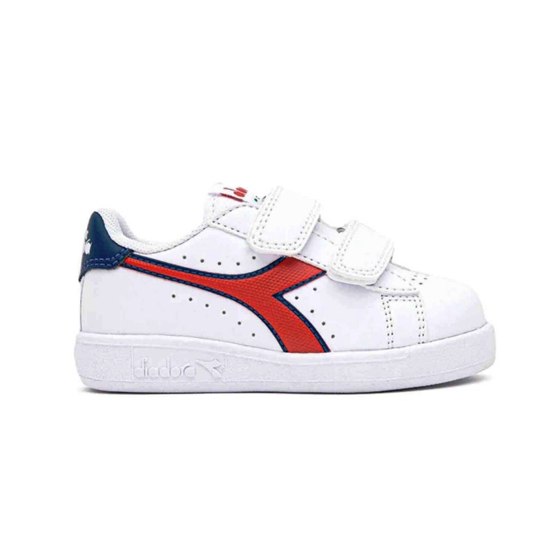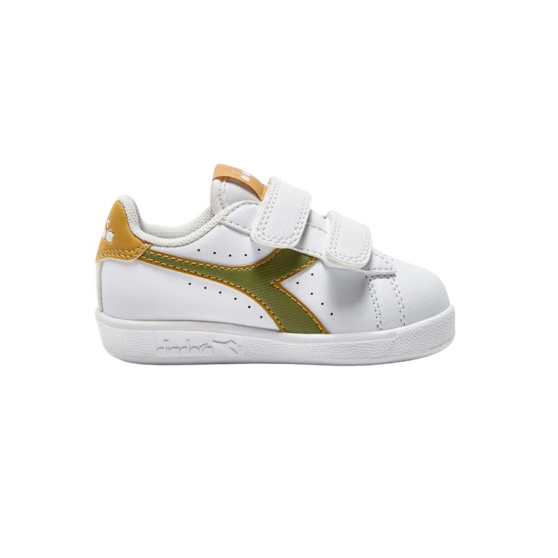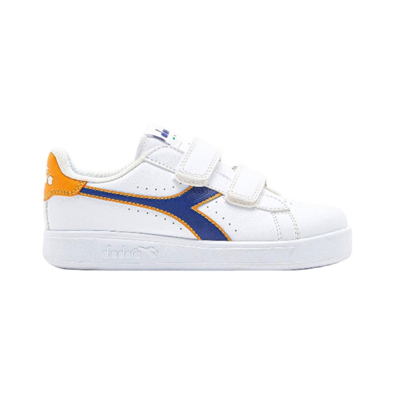 Sneaker per bimbi low cut, dettagli traforati, pratica chiusura a strappo, fregio, linguetta e back abbinati.