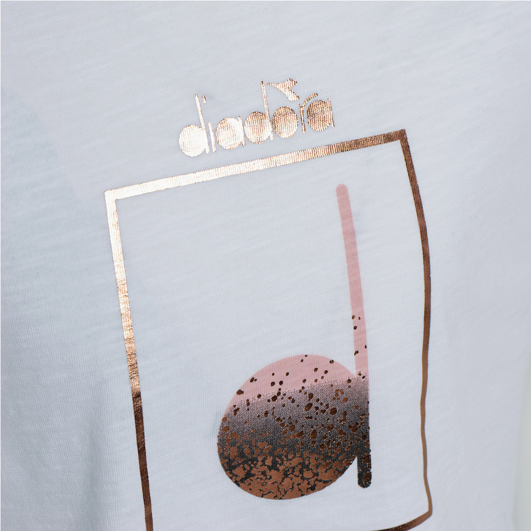 T-shirt e leggings bambina realizzati in cotone organico certificato GOTS (Certificazione ICEA nr. GOTS 2019-057). Grafica colorata a tema d di diadora sulla maglia e leggings corti vita logata diadora.