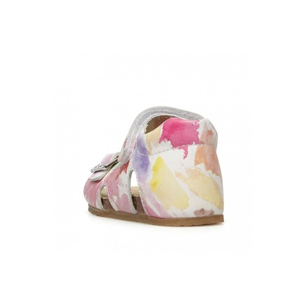 Una bellissima stampa acquerellata caratterizza questo sandalo aperto con tomaia in morbido vitello. Sandalo aperto, con velcro e fibbia  per offrire una calzata personalizzata,  tallone strutturato e imbottitura alla caviglia che sostengono il movimento anche dei piedini inesperti. Fodera interna e soletta in pelle assicurano un comfort prolungato. Suola anatomica in mescola di sughero,fondo in gomma antiscivolo
