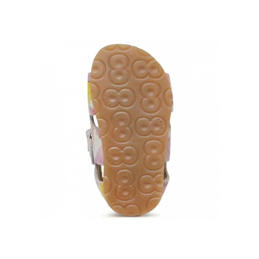 Una bellissima stampa acquerellata caratterizza questo sandalo aperto con tomaia in morbido vitello. Sandalo aperto, con velcro e fibbia  per offrire una calzata personalizzata,  tallone strutturato e imbottitura alla caviglia che sostengono il movimento anche dei piedini inesperti. Fodera interna e soletta in pelle assicurano un comfort prolungato. Suola anatomica in mescola di sughero,fondo in gomma antiscivolo