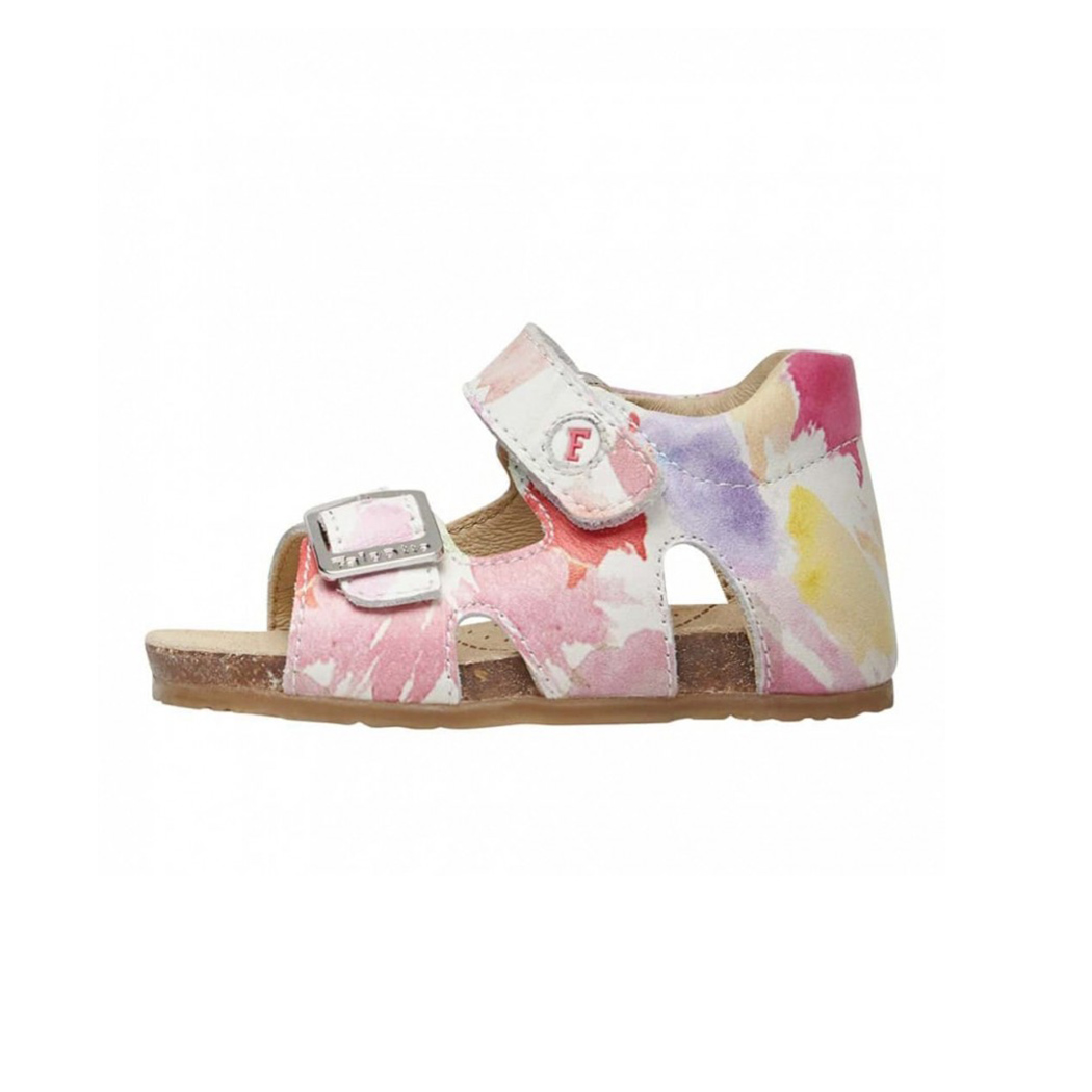 Una bellissima stampa acquerellata caratterizza questo sandalo aperto con tomaia in morbido vitello. Sandalo aperto, con velcro e fibbia  per offrire una calzata personalizzata,  tallone strutturato e imbottitura alla caviglia che sostengono il movimento anche dei piedini inesperti. Fodera interna e soletta in pelle assicurano un comfort prolungato. Suola anatomica in mescola di sughero,fondo in gomma antiscivolo