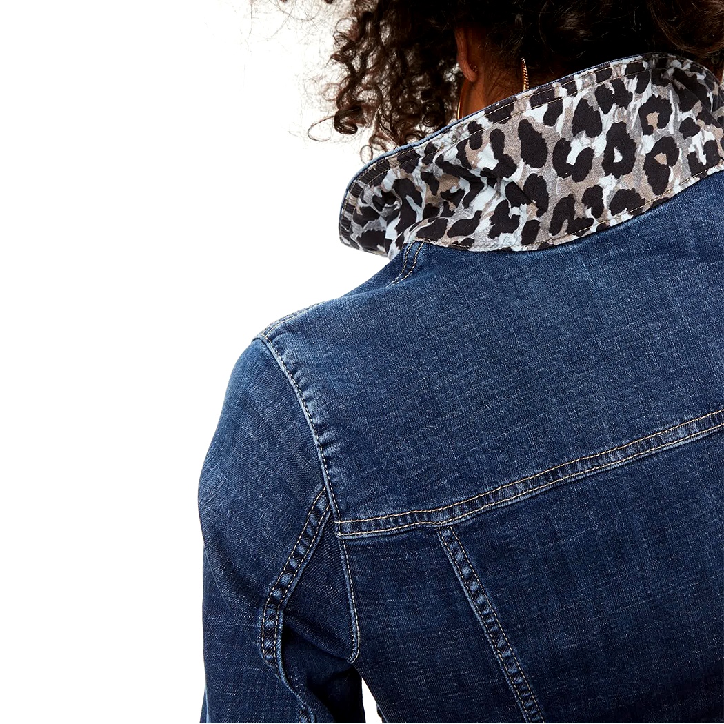 Giubbino jeans corto in tessuto stretch con vestibilità slim fit. Bottoni colore oro. Tasce frontali con patta + tasche aperte. Retro del colletto e interno polsino in tessuto fantasia maculata
