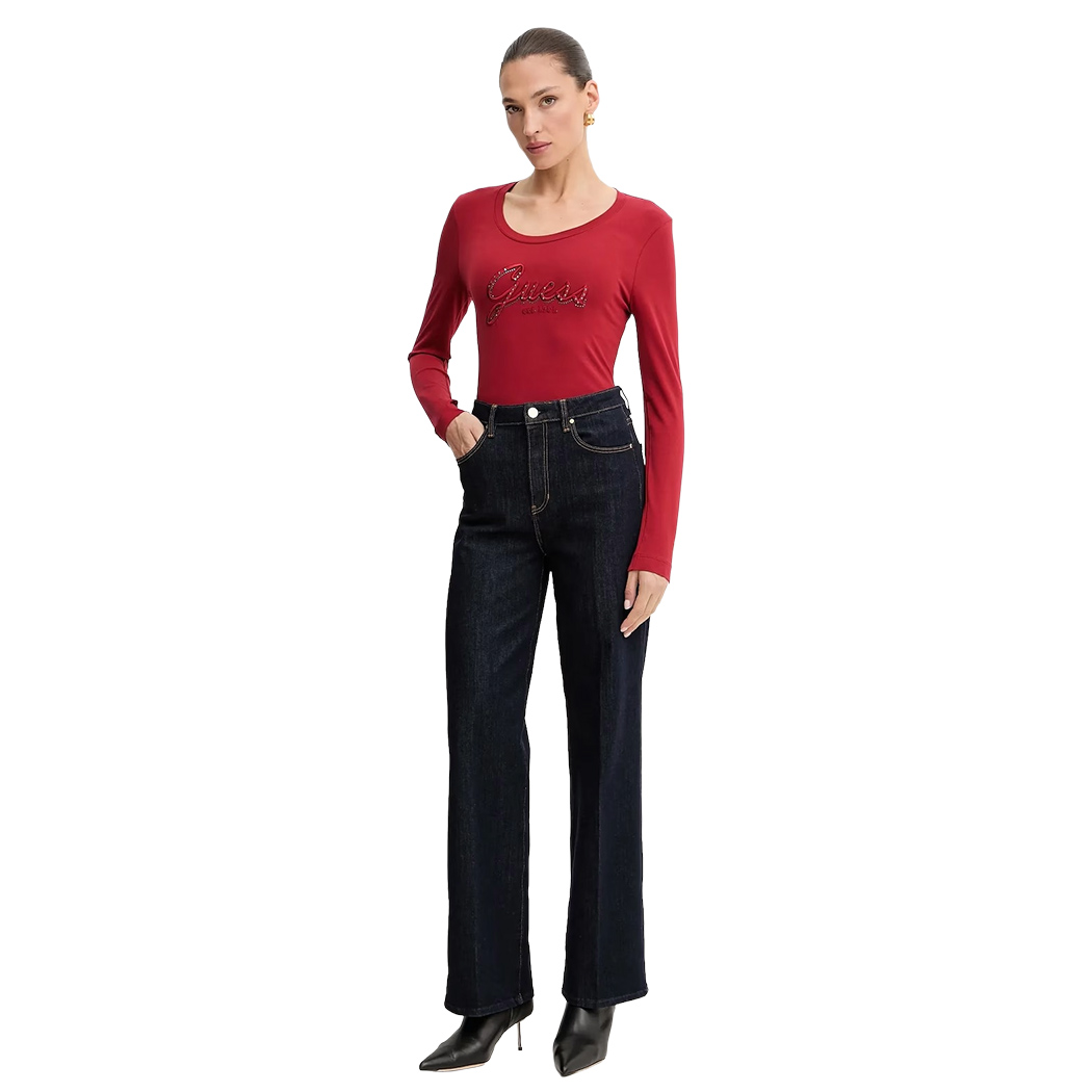 GUESS T-SHIRT MAGLIETTA DONNA MANICA LUNGA LOGO FRONTALE STRASS W5YI26J1314