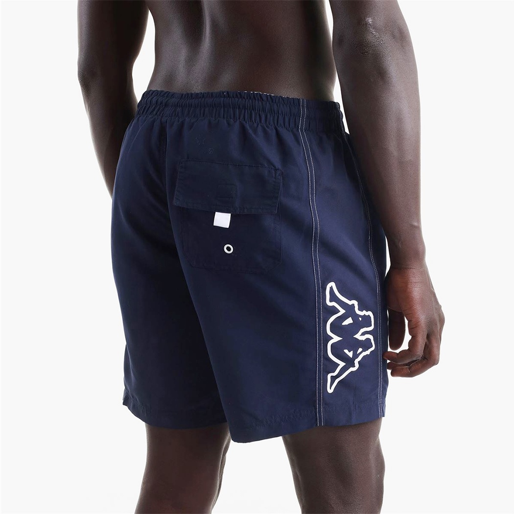 SPORT. Short mare da uomo, in tessuto microfibra mano pesca. REGULAR FIT. Elastico in vita e coulisse regolabile, inserti laterali. Tasca posteriore con patta e occhiello in metallo, slip interno in rete. Logo Omini outline stampati a contrasto su entrambi i lati.