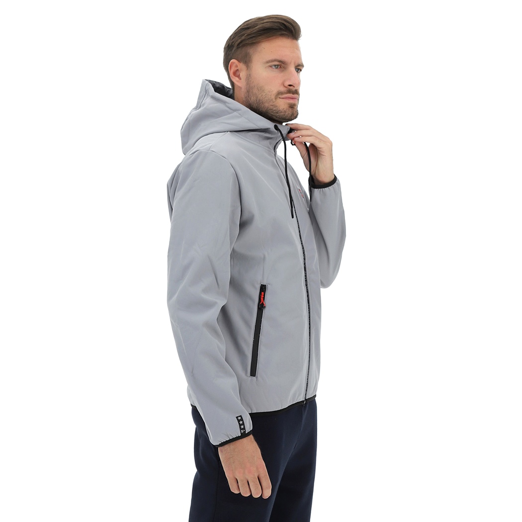 Giubbotto full zip in tessuto softshell con interno in micropile. Cappuccio regolabile con coulisse. Tasche laterali con cerniera.Elastico sui polsi e sul fondo. Piccoli loghi frontali. Leggero, caldo e comodo.