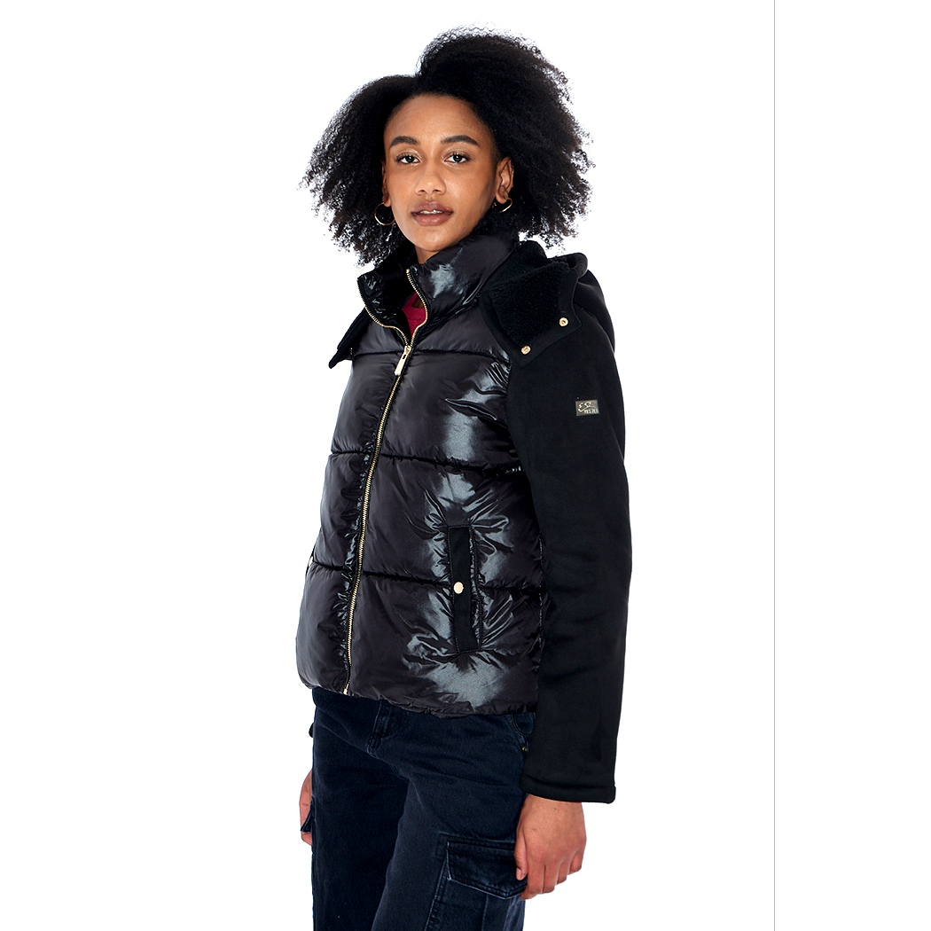 Piumino Yes Zee da donna trapuntato lucido a tinta unita. Giacca dal taglio sagomato, con cappuccio removibile con zip. Maniche in montoncino ecologico.