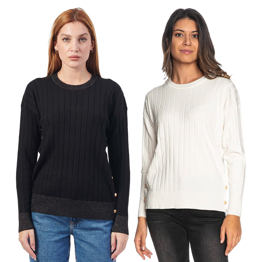 Maglioncino a manica lunga firmato Yes Zee modello girocollo in misto viscosa con spacchi laterali, bottoni dorati, vestibilità regolare.