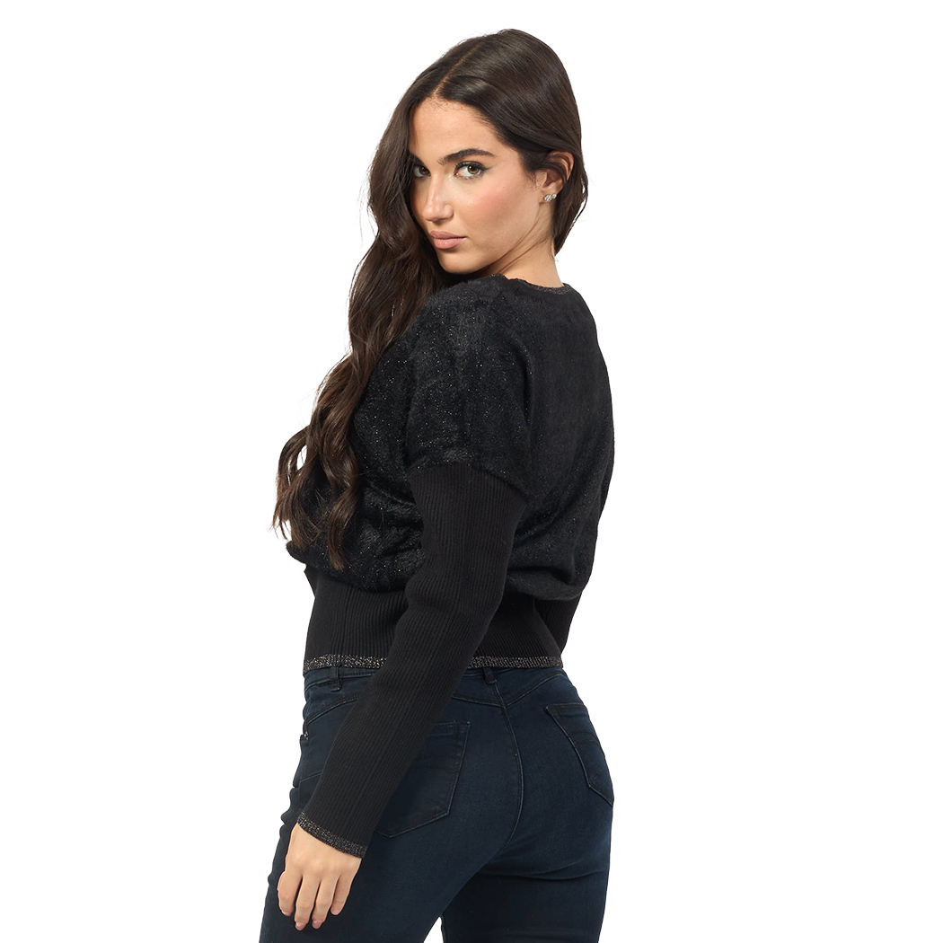 Il pullover Yes Zee è il capo ideale per la donna che cerca comfort e stile in un'unica soluzione. Realizzato in filato effetto mohair misto poliammide e poliestere, con un leggero filo lurex tono su tono, questo pullover presenta un fit rilassato e maniche a kimono. Il dettaglio del cannolè alto in maglia a costine e la placchetta monogramma in metallo dorato applicata sul fondo aggiungono un tocco di classe e originalità. Ideale per un look casual chic, questo pullover darà un tocco di eleganza al tuo guardaroba.